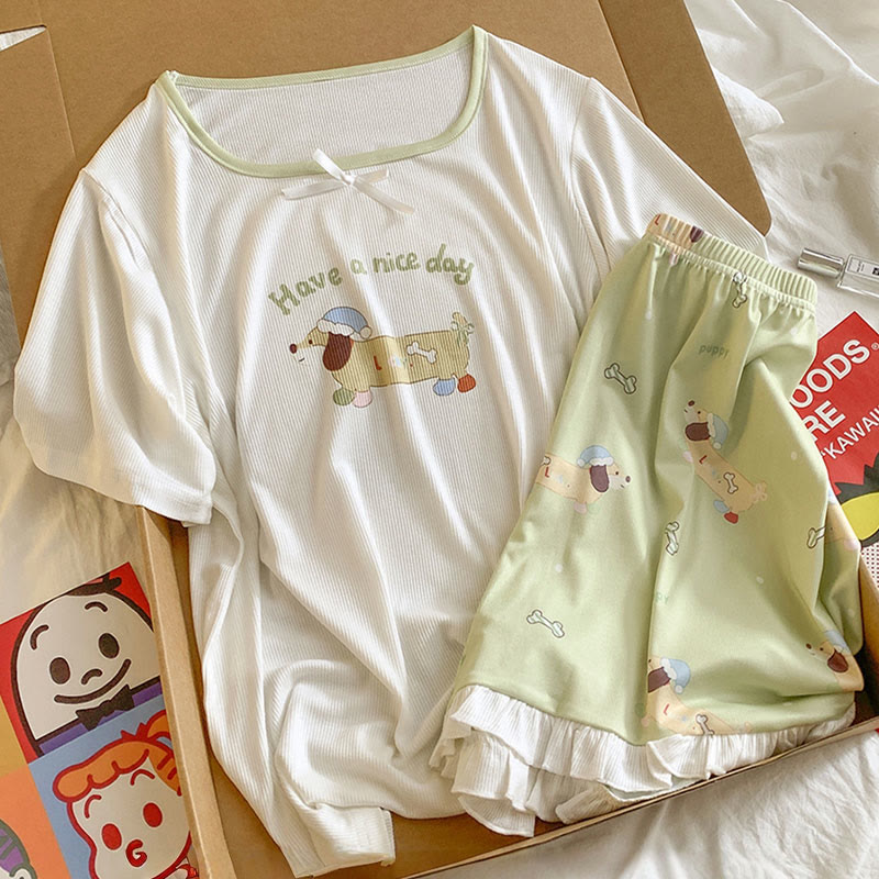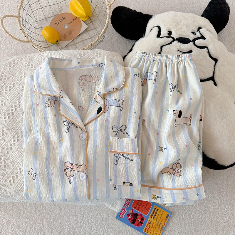 Zweiteiliges Pyjama-Set mit Streifen und Welpen-Print