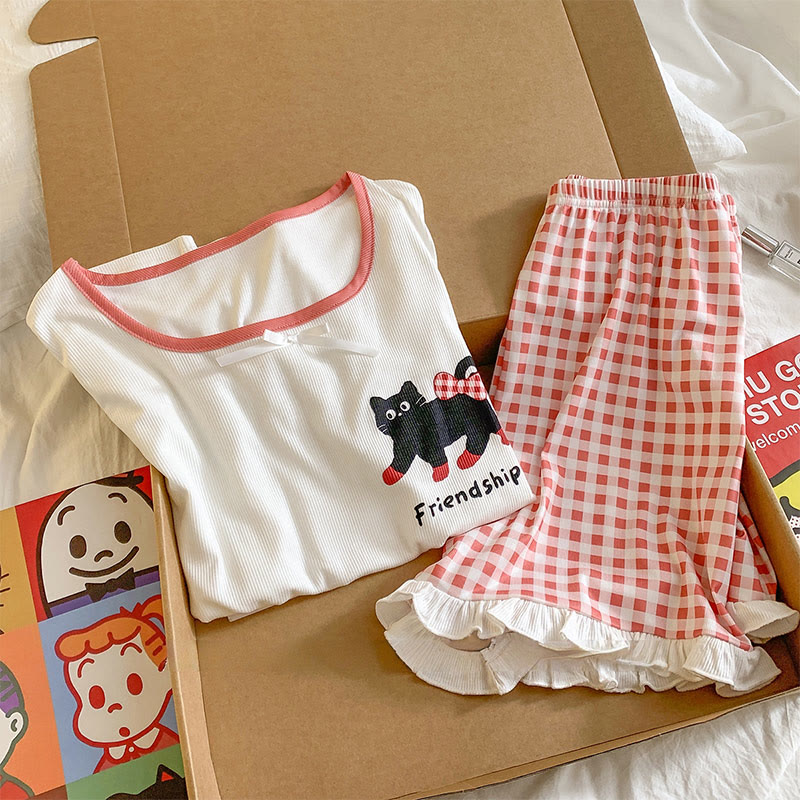 Zweiteiliges Pyjama-Set mit Kitty-Karomuster