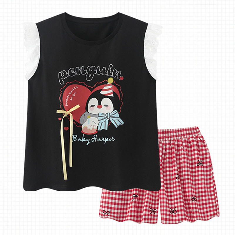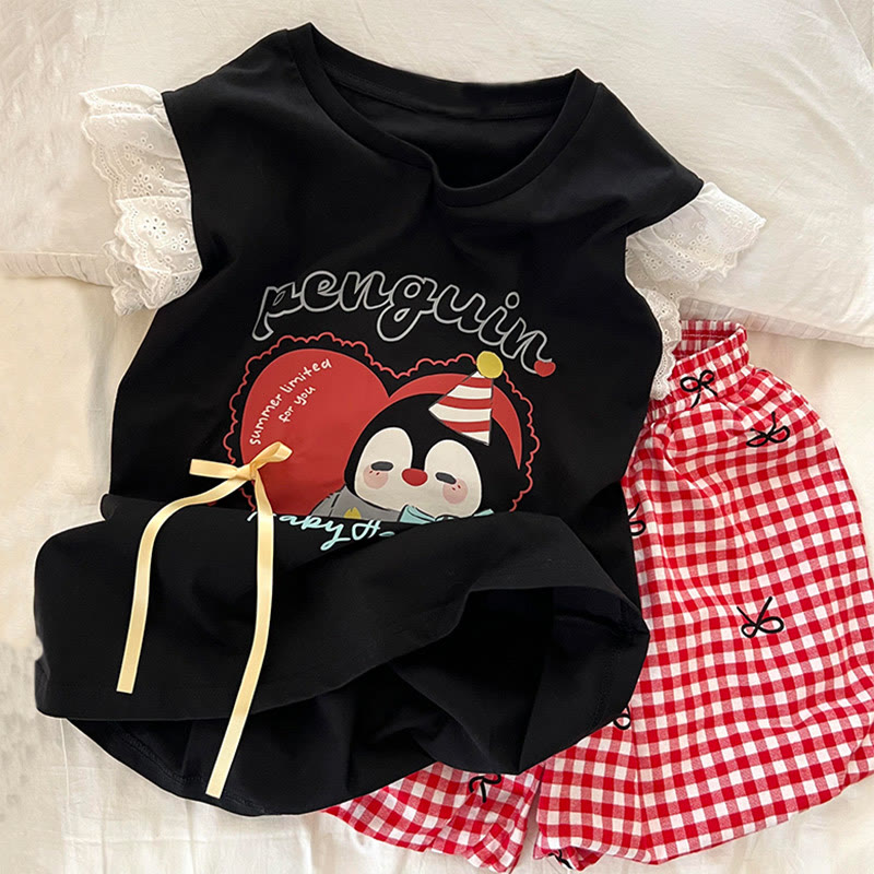 Zweiteiliges Pyjama-Set mit Pinguin-Schleife und Karomuster