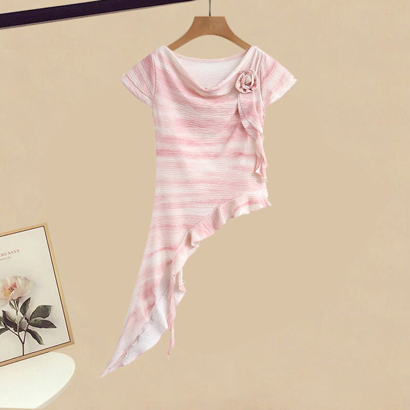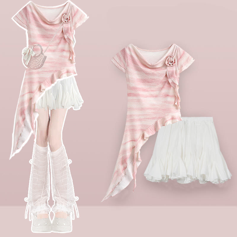 Zweiteiliges Set mit unregelmäßigem Oberteil und Puffrock mit 3D-Blume