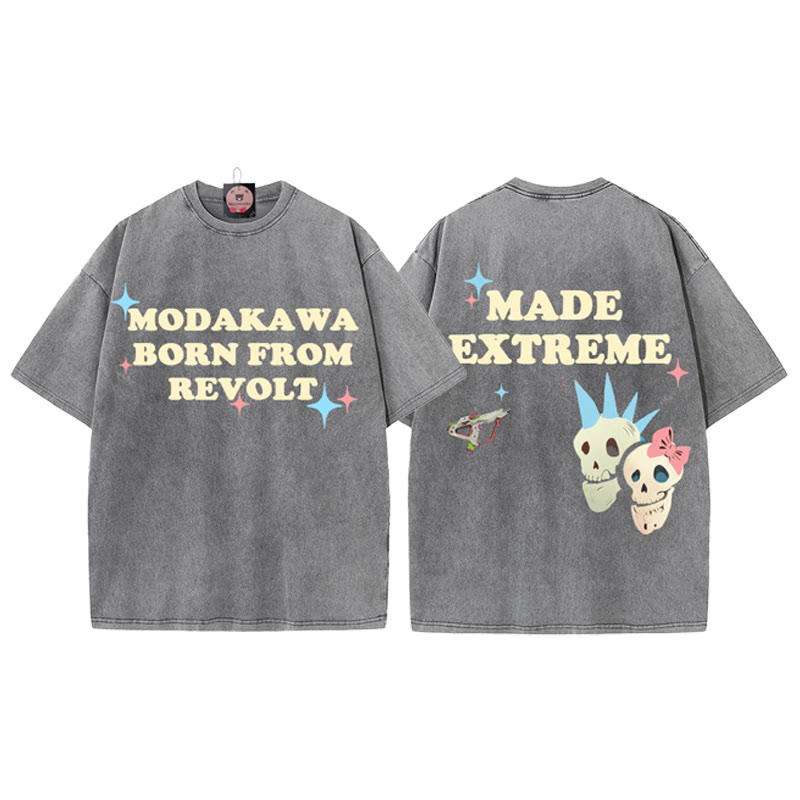 BORN FROM REVOLT – T-Shirt mit Totenkopf-Print und Vintage-Waschung, 100 % Baumwolle, Modakawa