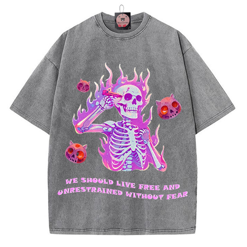 WIR SOLLTEN FREE UND HEMMUNGSLOS LEBEN, OHNE ANGST. T-Shirt aus 100 % Baumwolle mit Totenkopf-Print und Vintage-Waschung von Modakawa.