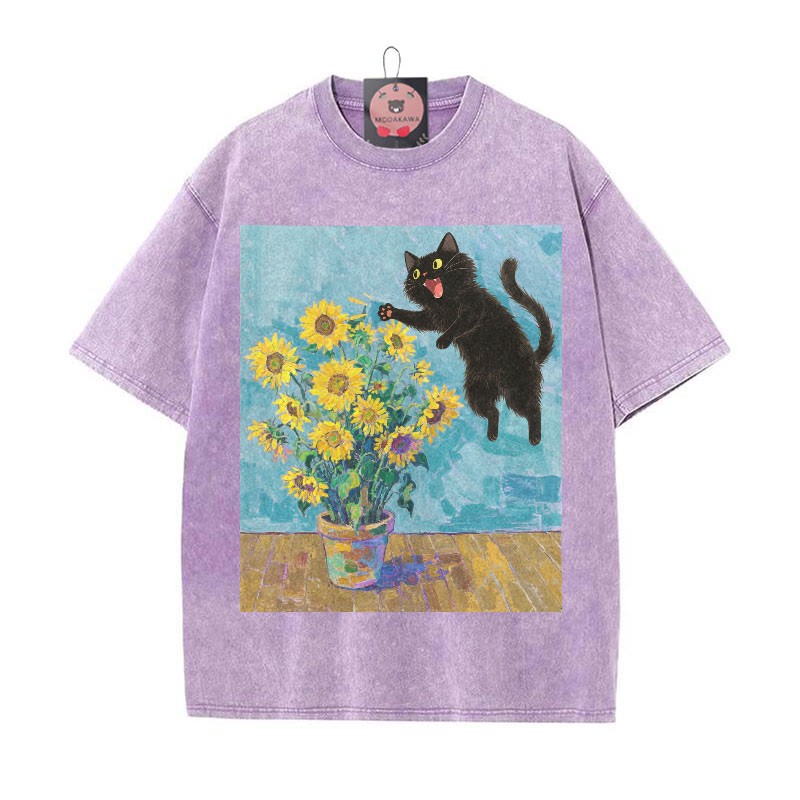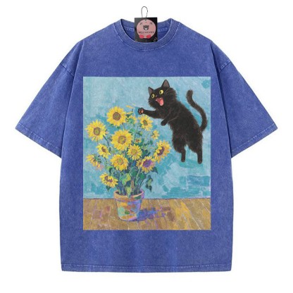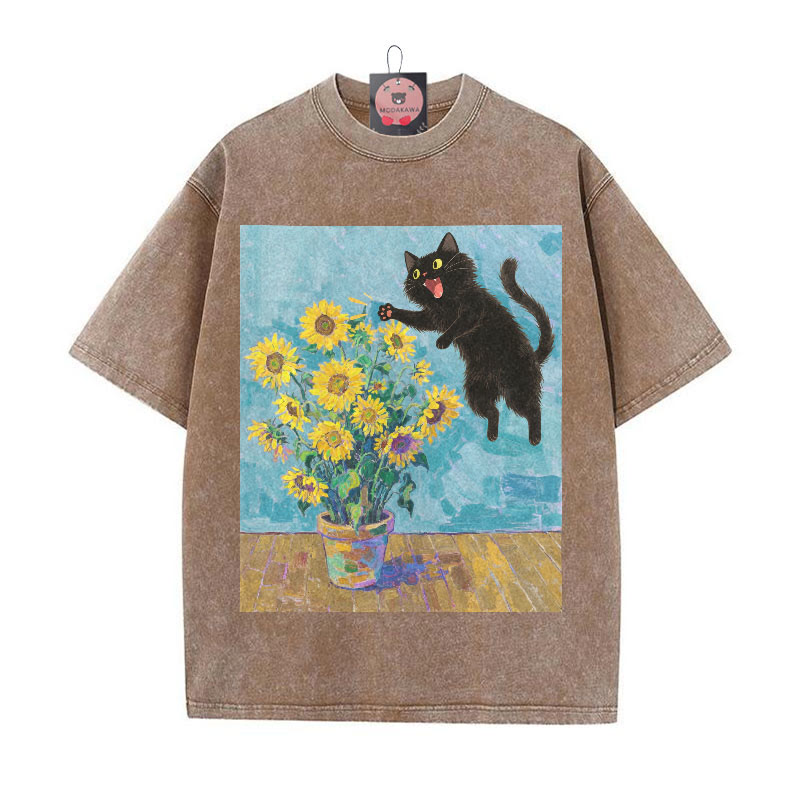 Kitty Sonnenblumendruck Vintage gewaschenes Modakawa-T-Shirt aus 100 % Baumwolle
