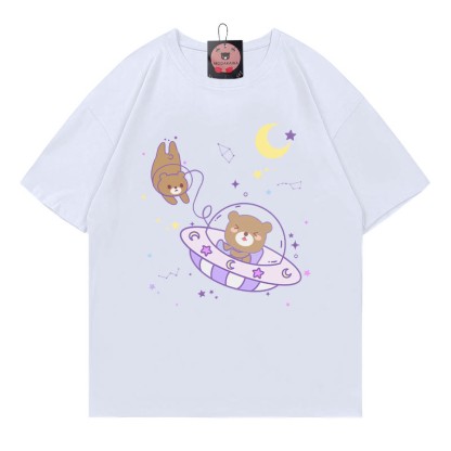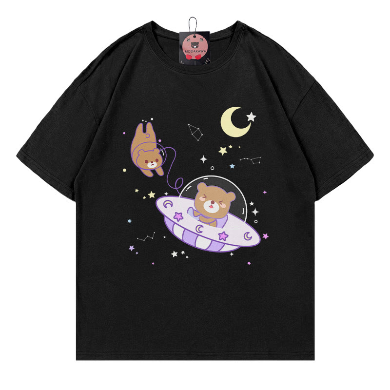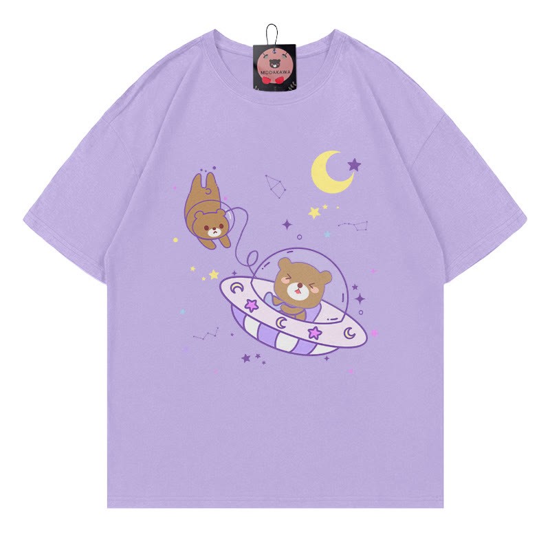 Modakawa T-Shirt mit Bären-Aufdruck und fliegender Untertasse, 100 % Baumwolle