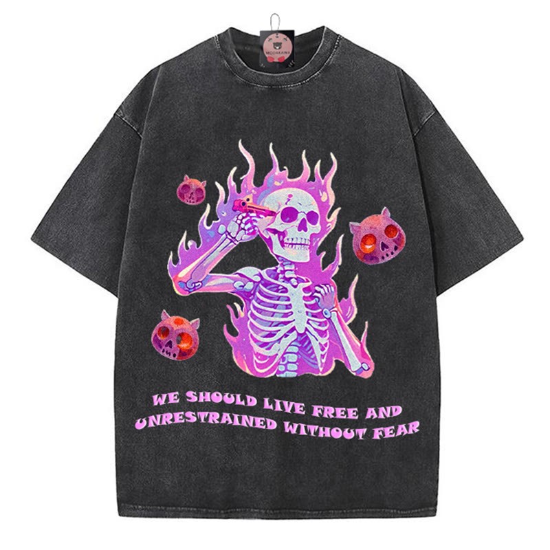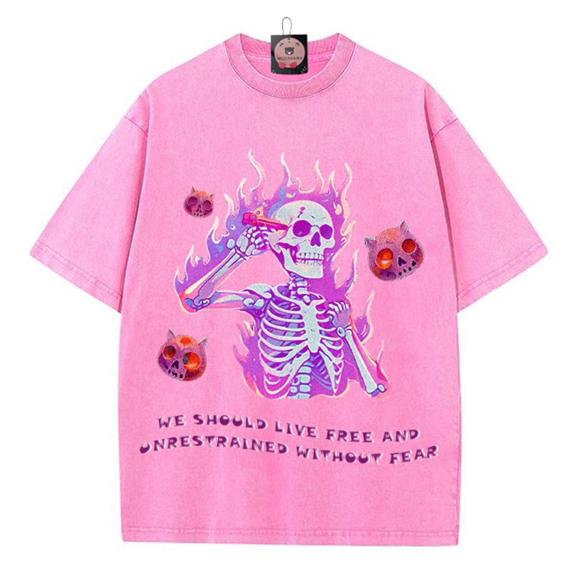 WIR SOLLTEN FREE UND HEMMUNGSLOS LEBEN, OHNE ANGST. T-Shirt aus 100 % Baumwolle mit Totenkopf-Print und Vintage-Waschung von Modakawa.